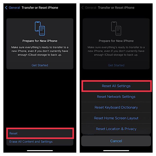 - Dirigez-vous vers leApplication Paramètres -> Général -> Transférer ou réinitialiser iPhone/iPad -> Réinitialiser -> Réinitialiser tous les paramètres.