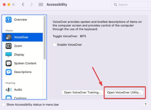 3. Cliquez surVoix offet sélectionnezFormation VoiceOver ouverte.