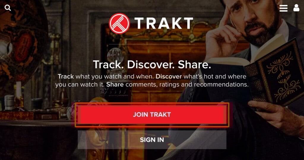 - VisiteSite Internet de Trakt TVsur n'importe quel navigateur Web et sélectionnezRejoindre le traitéouRejoignez Trakt gratuitementsur l'écran d'accueil.