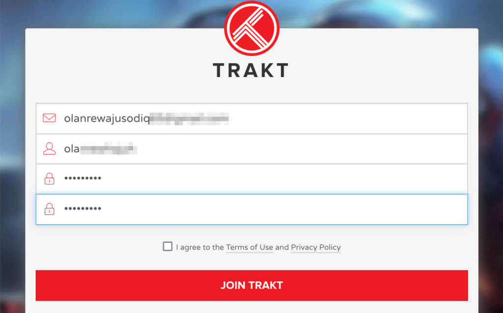 Fournissez les informations (email, nom d'utilisateur, mot de passe, etc.) requises pour créer un compte Trakt et passez à l'étape suivante.