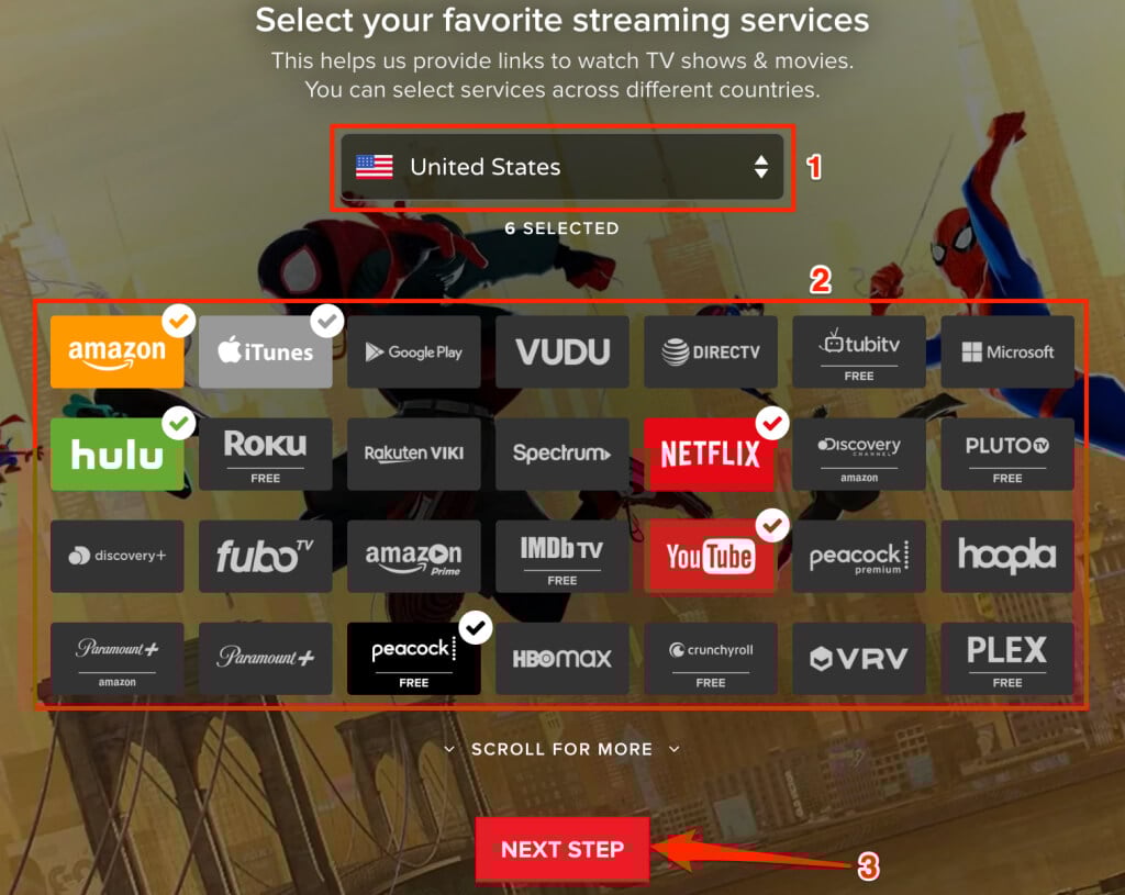 - Sélectionnez votre pays et les services de streaming que vous utilisez. SélectionnerÉtape suivantepour continuer.