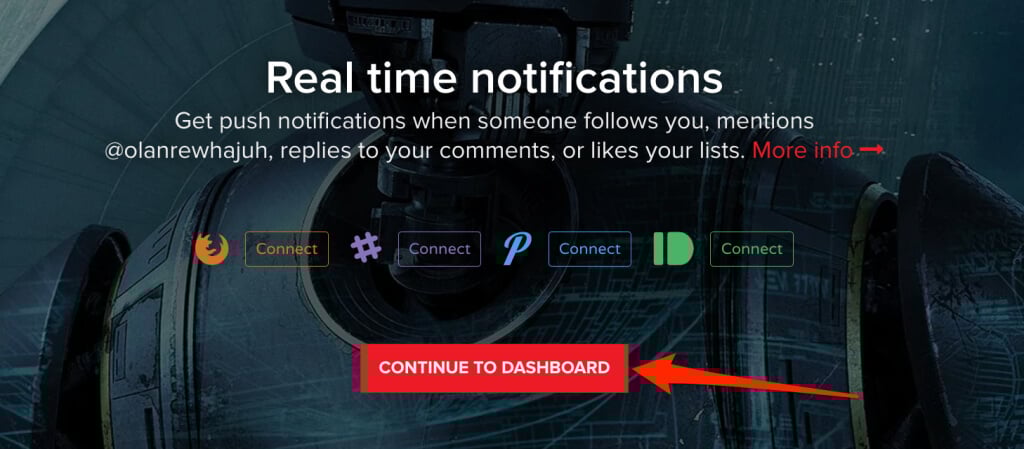 - Trakt peut envoyer des notifications push lorsque quelqu'un vous suit, répond à votre commentaire ou aime votre liste. Sélectionnez votre canal préféré (Slack, Pushbullet, Pushover, etc.) si vous souhaitez des notifications push pour ces actions. Sinon, ne sélectionnez rien et sélectionnezContinuer vers le tableau de bord.