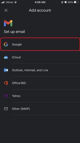 - appuyez surGooglepour ajouter un compte Gmail. Il vous sera demandé de confirmer que vous souhaitez ajouter un compte Gmail.