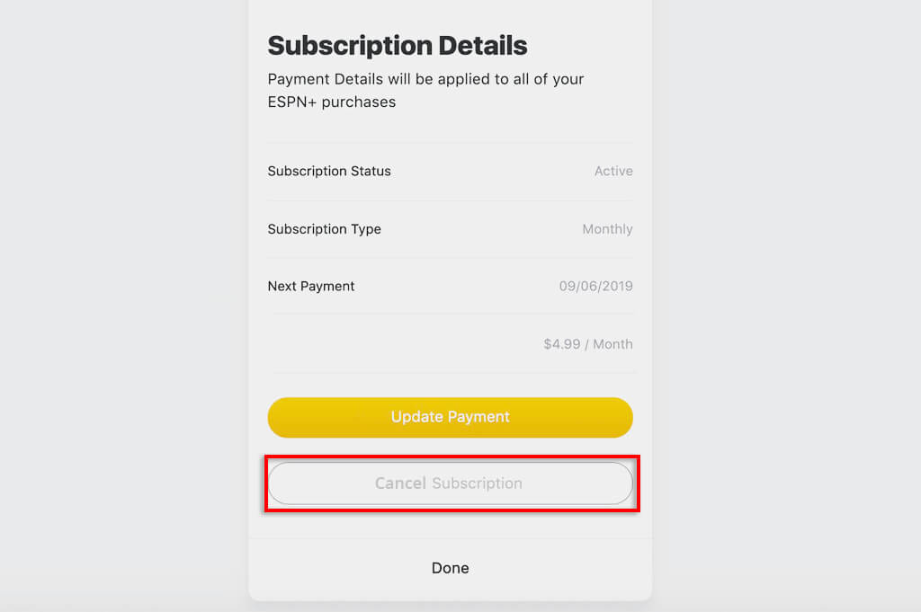 Note:ESPN+ ne propose pas de remboursement pour les cycles de facturation partiellement utilisés. Si vous annulez au milieu d’une période de facturation, vous aurez toujours accès à l’abonnement ESPN+ jusqu’à la fin de cette période.
