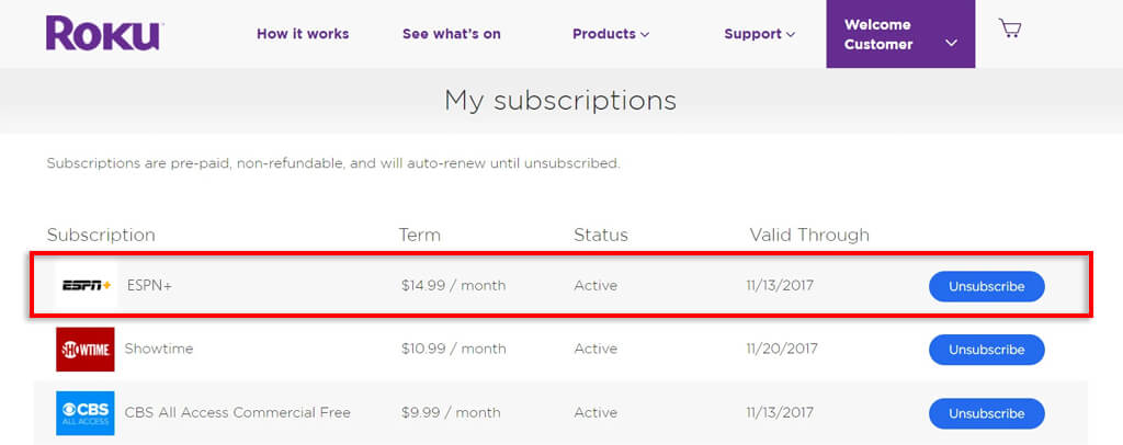 Si vous payez ESPN via Roku, vous pouvez annuler votre abonnement via le site Web de Roku :