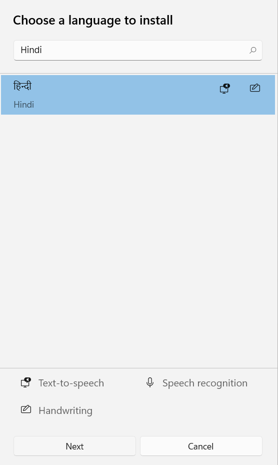 4.Maintenant, une fenêtre contextuelle s'ouvrira sur l'écran. Ici, tapez le nom de la langue dans laquelle vous souhaitez modifier la langue d'affichage. Une fois tapé, choisissez toutes les langues que vous souhaitez installer. Pour référence, nous choisissons ici l'hindi.