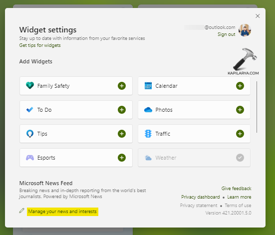 2.Dans les paramètres du widget, cliquez surGérez vos actualités et centres d'intérêtlien dans le coin inférieur gauche.