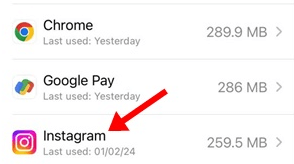 Étape 5 :Faites défiler la liste et recherchez l'application Instagram, puis appuyez dessus.