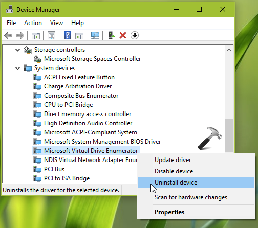 Note:Dans les étapes ci-dessous, il est supposé que Windows est installé sur C :. Dans ceexemple, nous avons montré les étapes à suivre pour supprimer Microsoft Virtual Drive Enumerator. Vous pouvez appliquer des étapes similaires au pilote que vous souhaitez désinstaller.