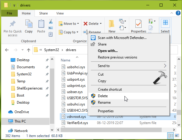 6.Comme à l’étape 3, nous avons obtenu l’emplacement réel du fichier du pilote. Alors on va àC:WindowsSystem32driversdossier et localisé le pilote. Vous pouvez simplement faire un clic droit sur le pilote et sélectionnerSupprimer. Si on vous le demandeAutorisations UAC, fournissez-les pour terminer l’opération.