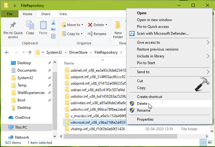 7.Ensuite, nous supprimons le fichier .inf du lecteur. Donc, comme nous avons obtenu le nom Inf à l'étape 2, utilisez-le comme initiales et avec l'aide de ceci, localisez le dossier inf du pilote dansC:WindowsSystem32DriverStoreFileRepository. Faites un clic droit sur le dossier pour le supprimer, fournissez les autorisations UAC pour terminer.