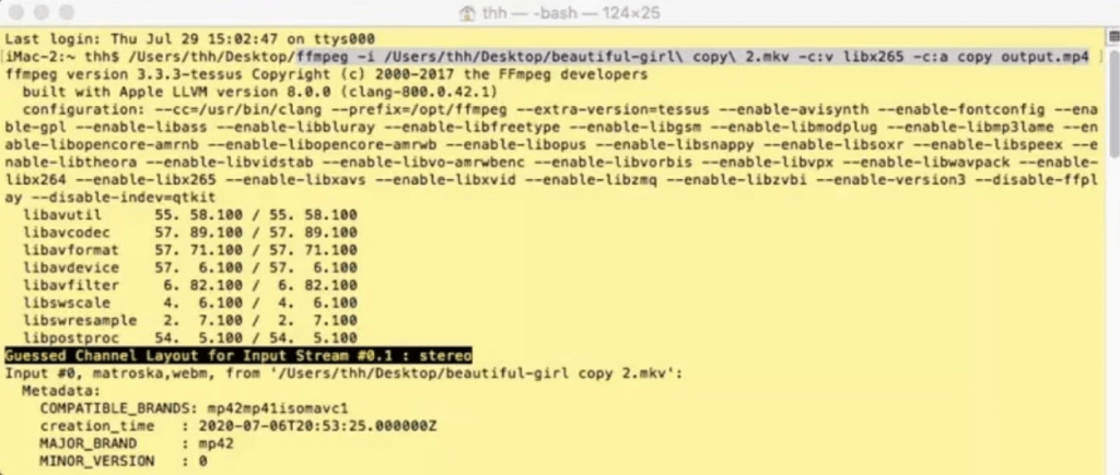 Pour conserver le codec audio d'origine, saisissez :"ffmpeg -i input.mkv -c:v libx265 -c:a copy output.mp4".