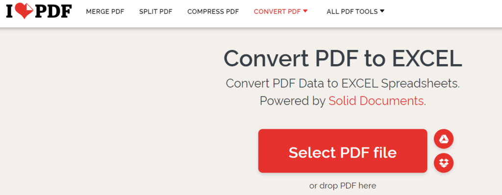 Si vous souhaitez convertir gratuitement votre PDF en Excel, vous devez utiliser le convertisseur PDF en ligne appelé I Love PDF. Il s'agit d'un site Web de conversion gratuit qui offre de nombreuses fonctionnalités. Cependant, vous avez besoin d'un accès Internet pour utiliser cette conversion et des doutes sur la confidentialité peuvent surgir lorsque vous téléchargez votre fichier PDF en ligne. Voici les étapes pour convertir votre PDF en Excel gratuitement :