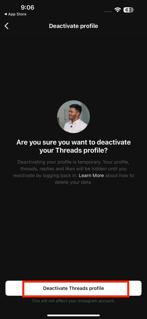 6.Appuyez surDésactiver le profil Threadspuis confirmez-le en appuyant surDésactiver.