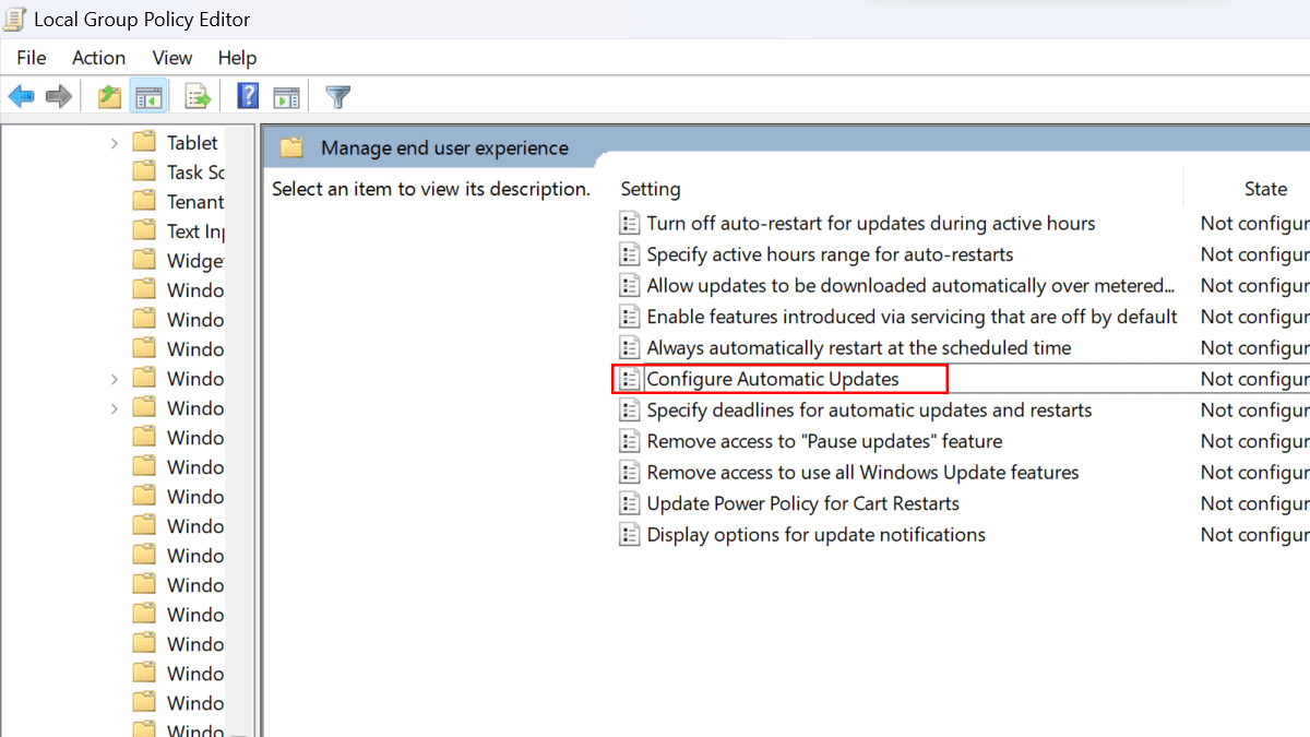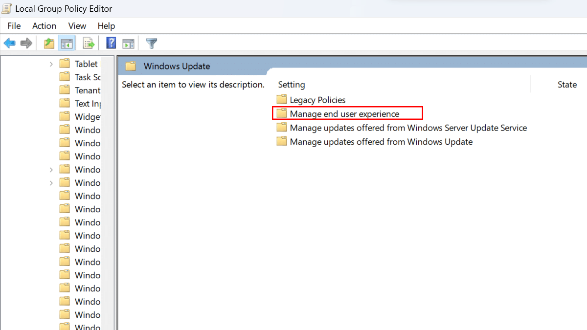 - Je suis arrivé au chemin suivant :Configuration de l'ordinateur>Modèles d'administration>Composants Windows>Mise à jour Windows> ouvrez le "Gestion et expérience utilisateur”.