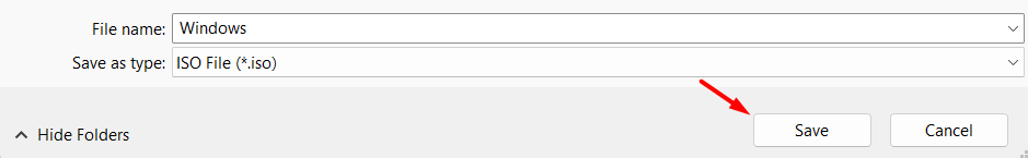 9.Vous recevrez maintenant une invite pour enregistrer le fichier image disque Windows 11 Insider Preview. CliquezSauvegarderpour enregistrer le fichier ISO de Windows 11 sur votre stockage local.