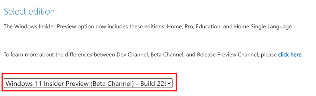 4.Déplacer vers leSélectionnez l'éditionrubrique sur leTéléchargements de Windows 11 Insider Previewpage.
