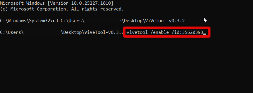 8.Utilisez maintenant la commande vivetool /enable /id:35620393 pour activer le débordement de la barre des tâches sur votre PC.