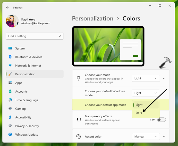 3.Sous Couleurs, localisez l’en-tête Choisissez votre mode. S'il est réglé sur Clair ou Foncé, réglez-le surCoutume. Ensuite, vous pouvez choisir votre mode d'application par défaut et le définir surSombrepour activer le mode sombre uniquement pour les applications.
