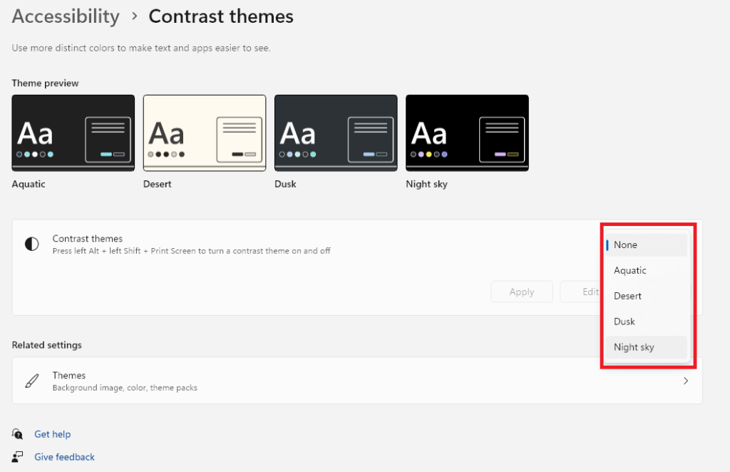 4.Cliquez sur leAucunoption à côté deThèmes contrastéspour obtenir une liste des thèmes disponibles.
