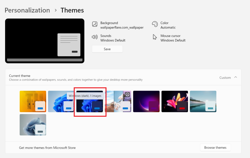 De plus, si vous n’avez pas trouvé de thème à votre goût, utilisez leParcourir le thèmeoption pour explorer la bibliothèque du Microsoft Store pour les thèmes Windows 11.