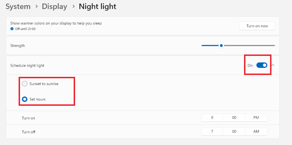 10. Activer leProgrammer la veilleuseoption si vous souhaitez que la fonctionnalité soit activée automatiquement. Pour l'automatisation, vous disposez de deux options : La première vient deDu coucher du soleil au lever du soleil,et l'autre vous permet de définir des heures personnalisées.