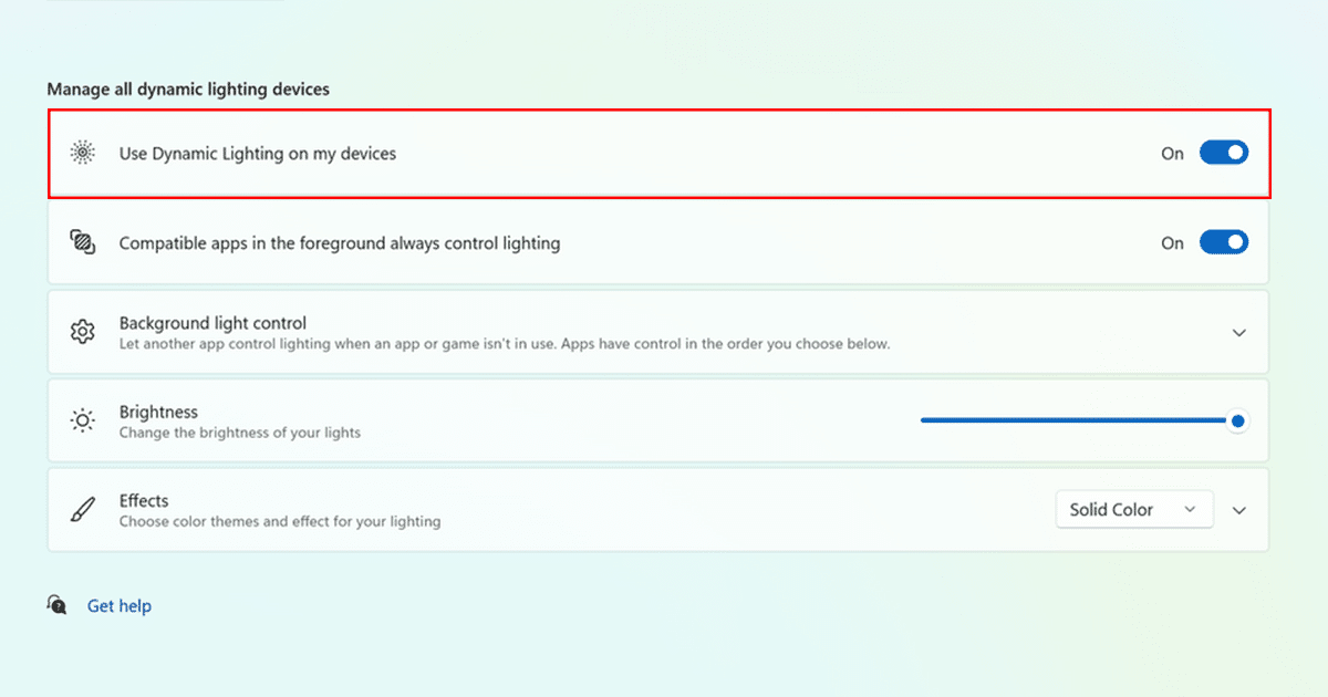 - Une fois que vous avez activé Dynamic Lighting, vous pouvez ajuster les paramètres à votre guise. Par exemple, vous pouvez choisir un effet différent, régler la luminosité ou autoriser d'autres applications à contrôler l'éclairage.