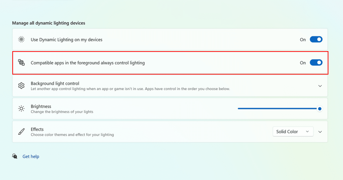 - Si vous souhaitez que d'autres applications puissent remplacer les commandes d'éclairage définies par Dynamic Lighting, activez l'option "Les applications compatibles au premier plan contrôlent toujours l'éclairage" option.