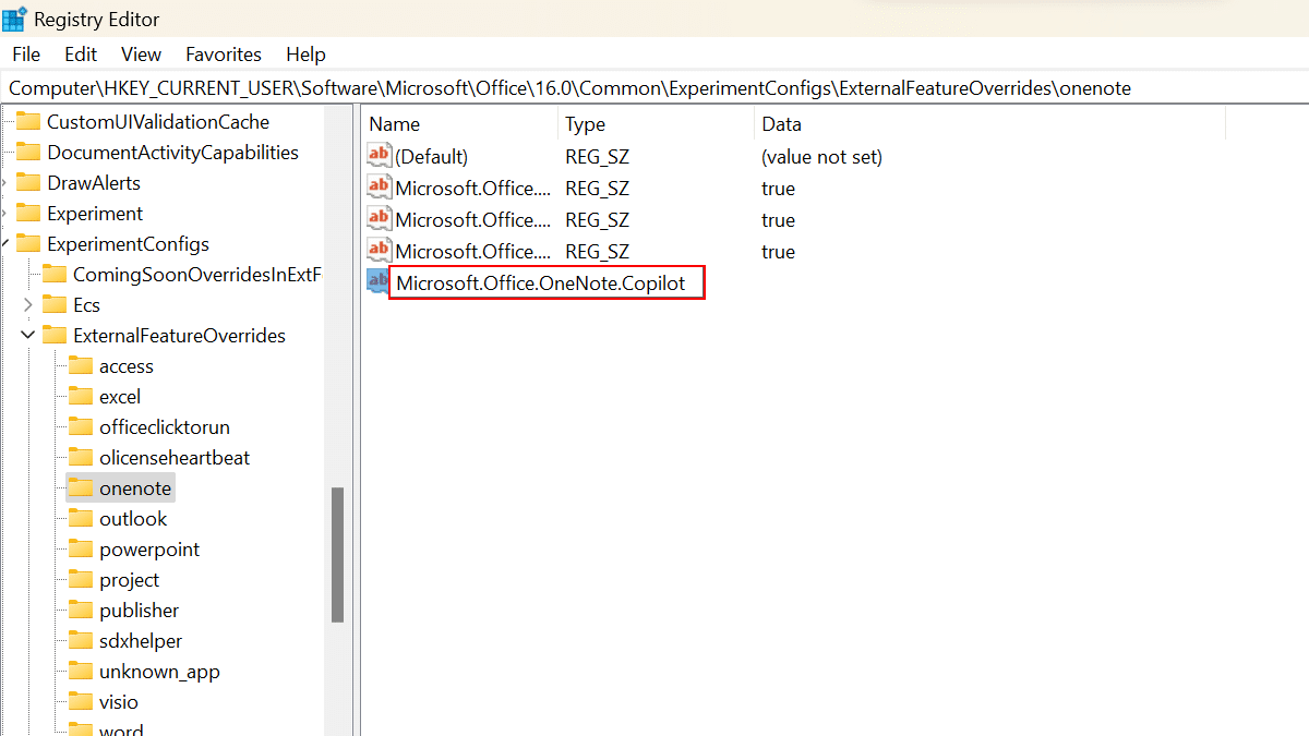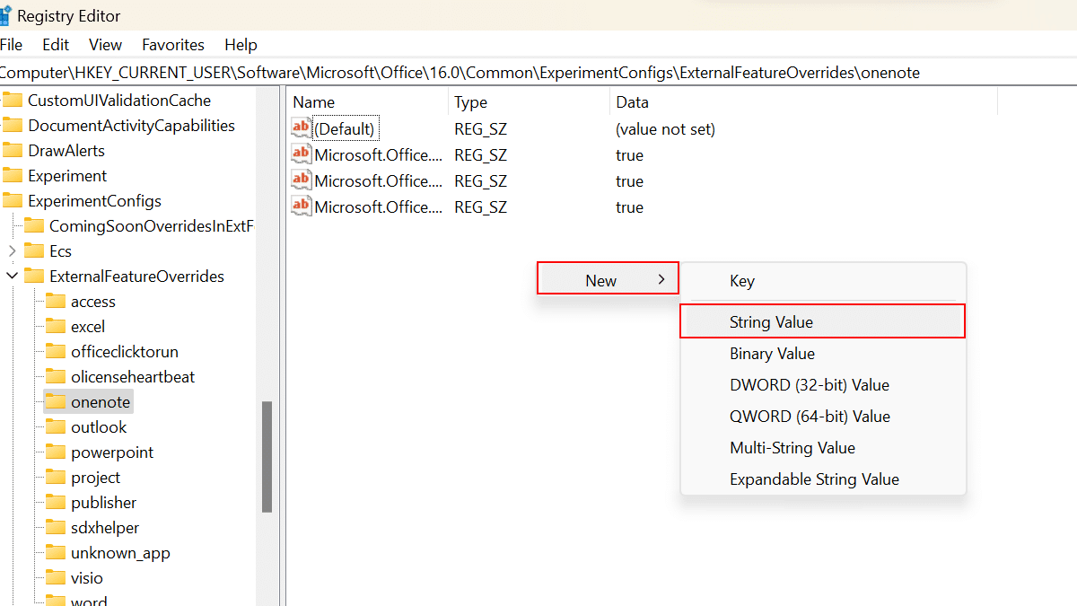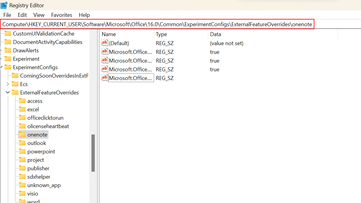 - Accédez au chemin suivant : ComputerHKEY_CURRENT_USERSoftwareMicrosoftOffice16.0CommonExperimentConfigsExternalFeatureOverridesonenote