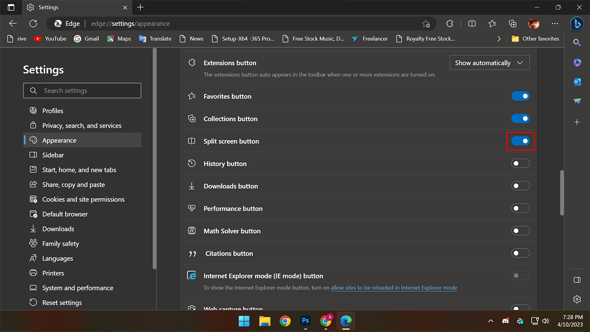 Facultatif: Si vous souhaitez activer ou désactiver la fonctionnalité, vous pouvez le faire à partir de la page des paramètres edge://settings/apparence sous la section « Sélectionner les boutons à afficher dans la barre d'outils ».