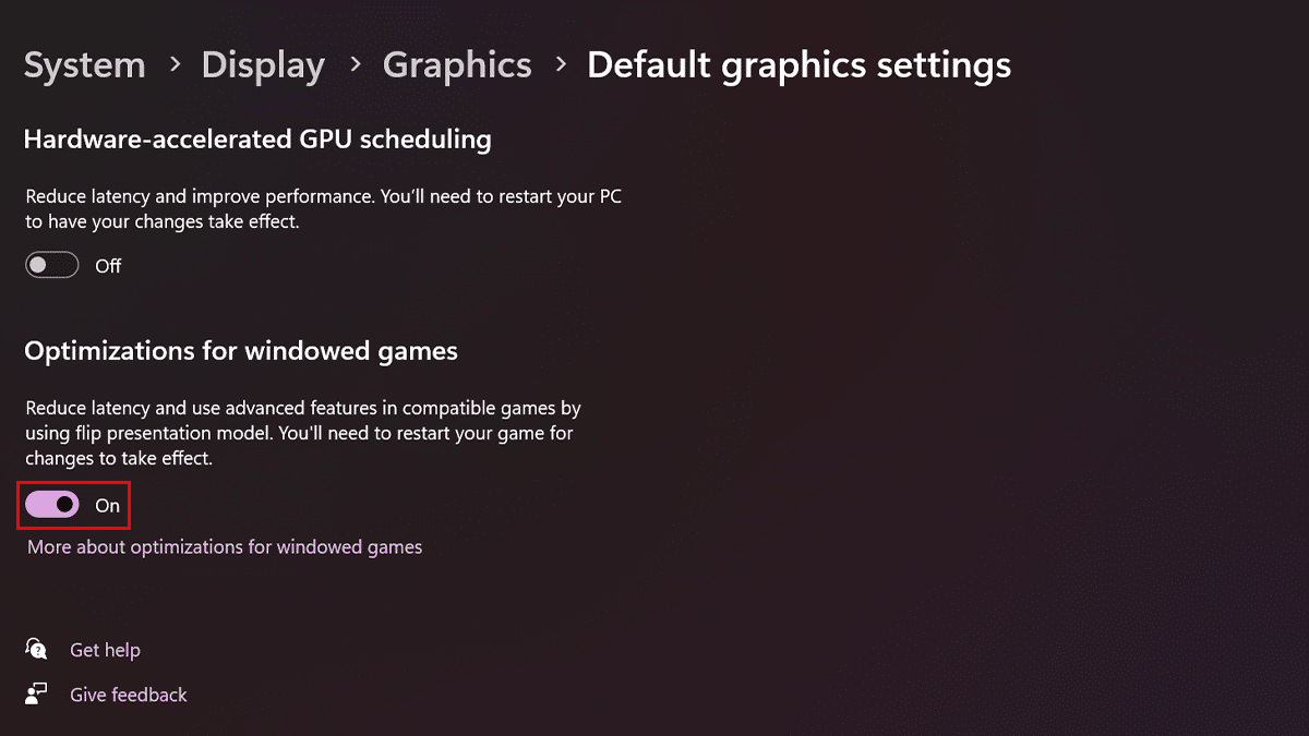 - Allumez le « Optimisations pour les jeux fenêtrés"interrupteur à bascule.