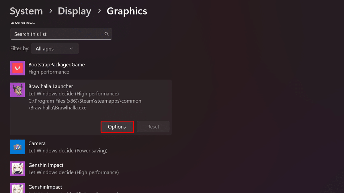- Sélectionnez l'application et cliquez sur lePossibilitésbouton.