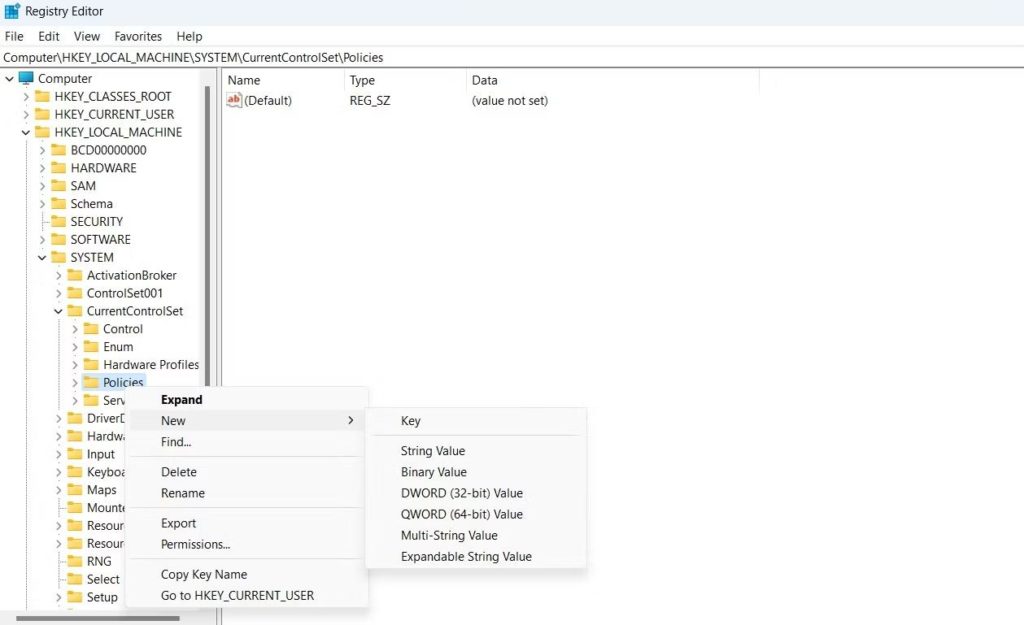 ComputerHKEY_LOCAL_MACHINESYSTEMCurrentControlSetPolicies