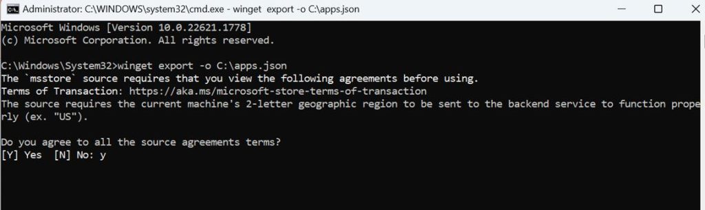 La commande susmentionnée générera un fichier appelé apps.json pour l'exportation Winget. De plus, un fichier texte avec l'intégralité de la sortie affichée dans l'invite de commande sera créé. Les applications exclues peuvent être téléchargées et installées manuellement ultérieurement à l'aide d'une copie de sauvegarde de ce fichier que vous pouvez créer.