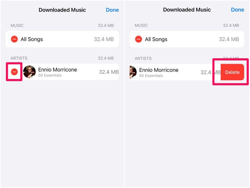 7.Si vous souhaitez supprimer toutes les chansons que vous avez téléchargées sur votre iPhone, appuyez sur l'icônecercle rouge à côté de l'option Toutes les chansonset puisappuyez sur le bouton Supprimerpour confirmer vos actions.