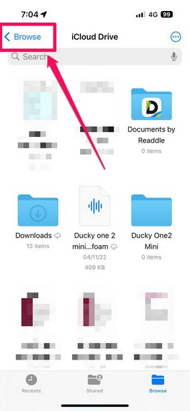 3.Si le dossier iCloud Drive s'ouvre dans l'onglet Parcourir, appuyez sur le boutonOption Parcouriren haut à gauche.