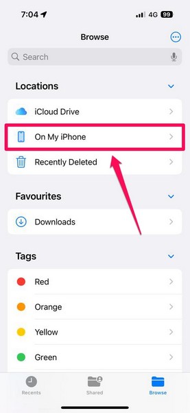 Ouvrez l'application Fichiers sur votre iPhone et accédez au dossier Téléchargements sous la section Sur mon iPhone pour rechercher vos fichiers téléchargés. À partir de là, vous pouvez supprimer des fichiers individuels ou tous.