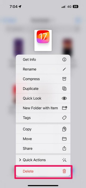 6.Si vous souhaitez supprimer un fichier téléchargé spécifique sur votre iPhone,appuyez et maintenez le fichieretsélectionnez l'option Supprimerdans le menu contextuel.