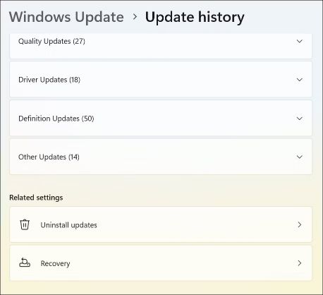 Étape 2 :Sélectionnez l'option Historique des mises à jour dans l'onglet Windows Update.