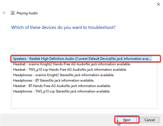 3.Attendez quelques secondes pour la fenêtre suivante et sélectionnez le périphérique audio que vous souhaitez dépanner. Après cela, cliquezSuivantet suivez les autres invites pour résoudre le problème.