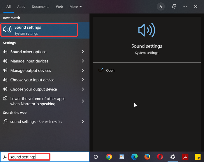 1.Taperparamètres sonoresdans la zone de recherche Windows et ouvrez le résultat.