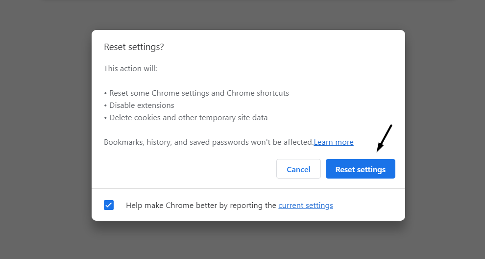 4.Enfin, cliquez sur leRéinitialiser les paramètresdans l’invite suivante pour enfin réinitialiser les paramètres de votre navigateur.