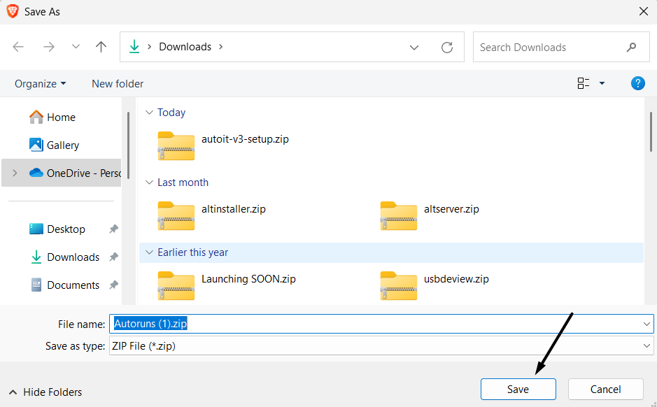 2.Cliquez surSauvegarderdans leEnregistrer sousfenêtre pour télécharger le fichier exécutable des Autoruns sur le PC.