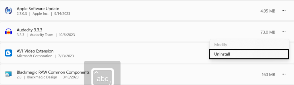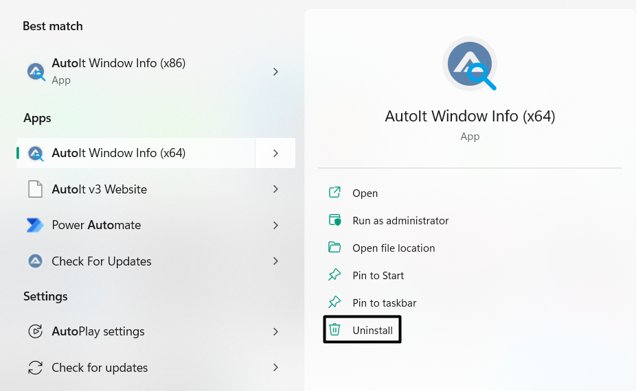 Un moyen simple de se débarrasser de l’erreur AutoIt sur Windows 11 consiste à complètementsupprimer l'application AutoItdepuis le PC. Cela résoudra certainement le problème. Si aucun programme nommé « AutoIt » n’est installé sur votre PC,cherchez un programme similairesur votre ordinateur. Vous pouvez suivre les étapes mentionnées ci-dessous pour savoir comment le supprimer de votre PC :