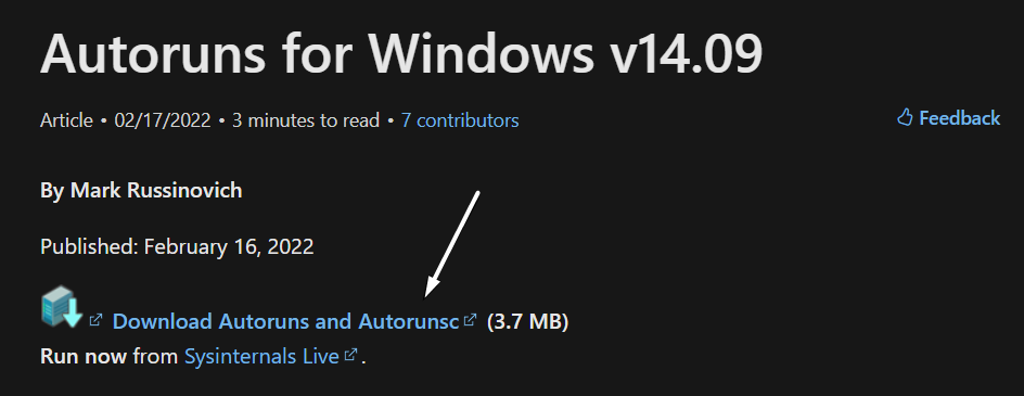1.Cliquezicipour accéder à la page de téléchargement d'Autoruns et cliquez surTélécharger Autoruns et Autorunsc.