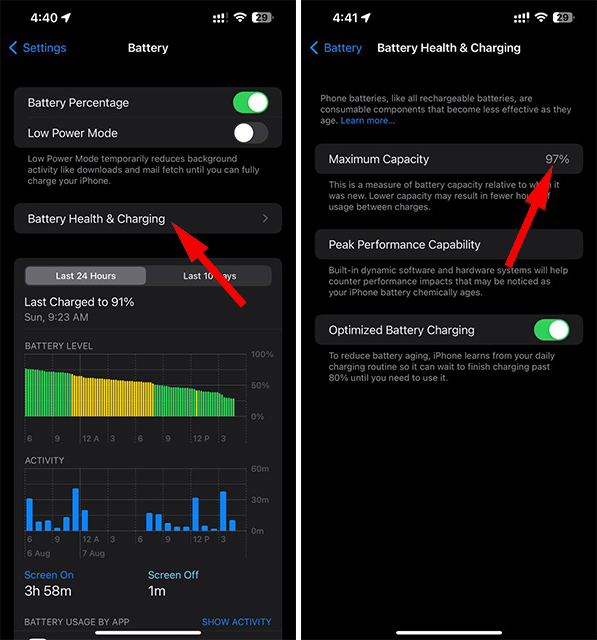 - Ensuite, appuyez sur la «santé de la batterie». Ici, vous trouverez des informations sur la capacité maximale actuelle de votre batterie. S'il est inférieur à 80%, ce pourrait être le coupable derrière votre problème de vidange de la batterie.