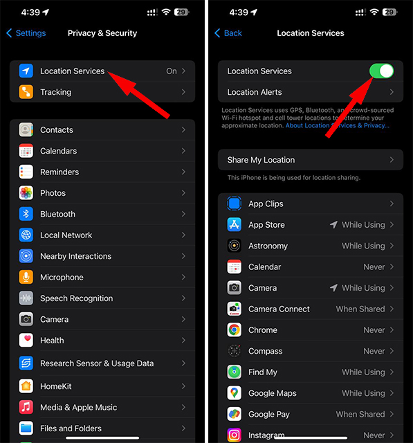 - Appuyez sur les services de localisation bascule pour le désactiver.