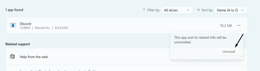 2.Dans leApplications installéessection, recherchezDiscorde, cliquez sur letrois points (…)à côté et sélectionnezDésinstallerde là.