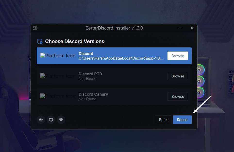 Une solution de contournement possible pour résoudre le problème de non-fonctionnement de BetterDiscord dans Windows 11 consiste àréparer BetterDiscord. Cela tuera de force BetterDiscord et le réinstallera pour résoudre les problèmes liés à celui-ci.