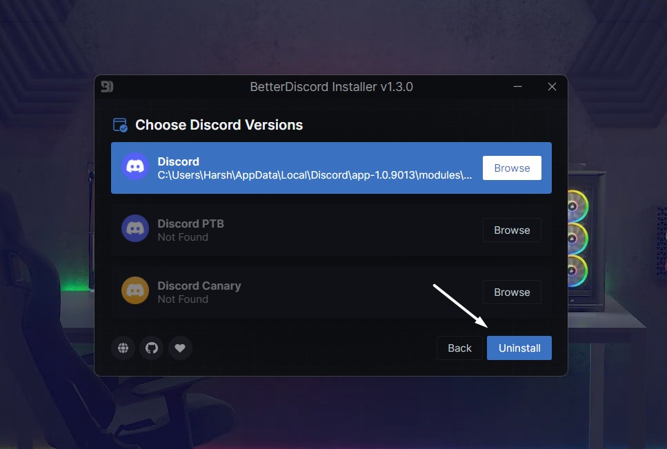 3.CliquezSuivantdans le coin inférieur droit de l’invite et sélectionnez la version Discord que vous souhaitez désinstaller.